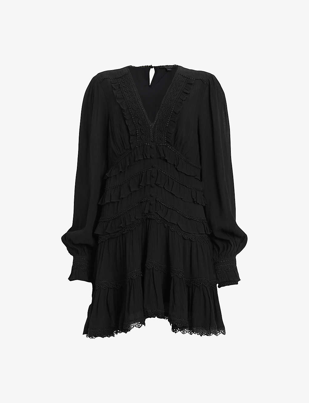 Turn heads with the AllSaints Zora Ruffled Woven Mini Dress. Featuring delicate ruffles and a flowing silhouette, this mini dress blends effortless charm with modern elegance. Perfect for day-to-night styling — and now available at a special limited-time price!