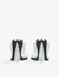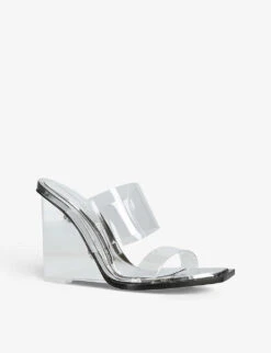 - Open toe, square toe, translucent double straps, wedge heel