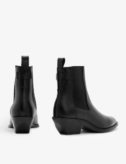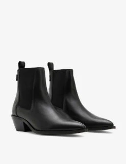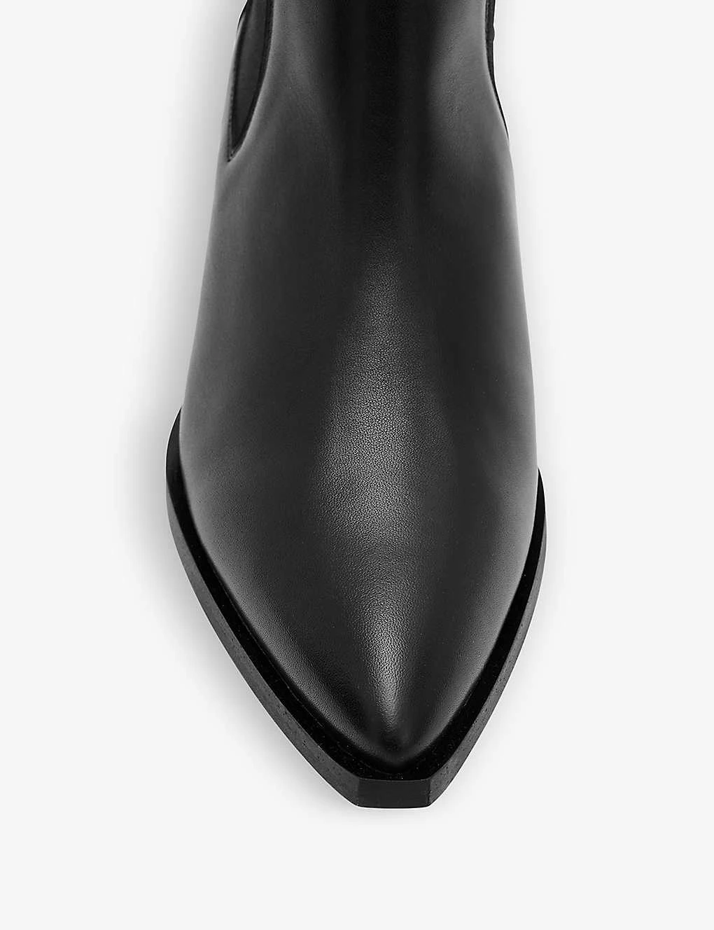 - Pointed toe, block heel, elasticated side panels, branded tab at back, smooth finish