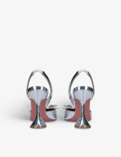 - Flared heel, sling back, pointed toe, silver-toned hardware, crystal-embellished bow