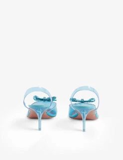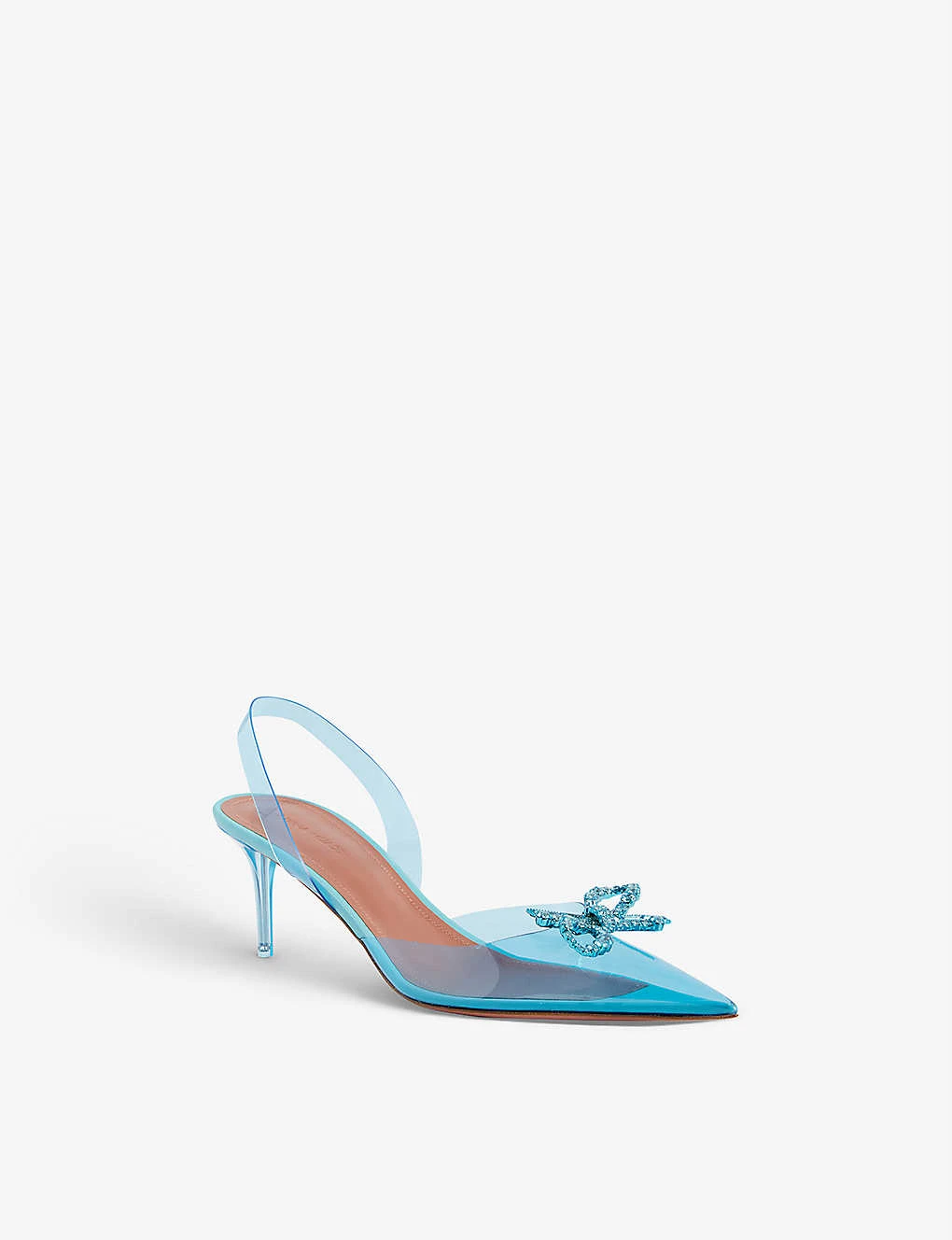 - Pointed toe, crystal embellishment at bow, sling back, kitten heel, all over transparent, lined
