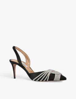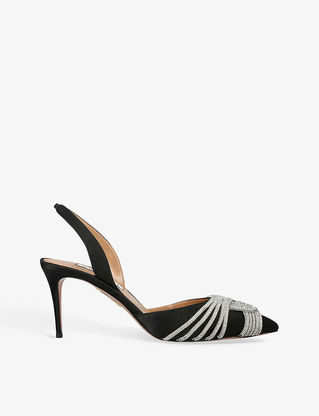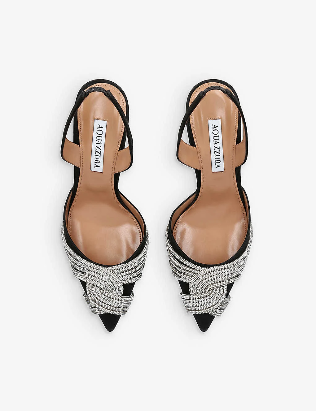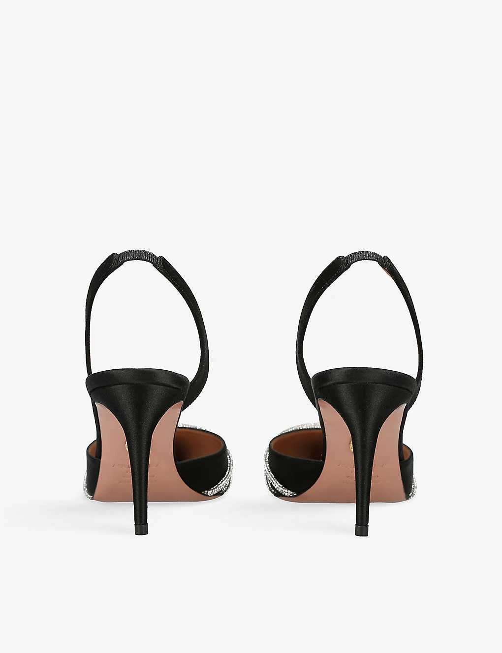 - Pointed toe, slingback strap, crystal embellishment on toe, covered stiletto heel