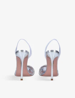 - Pointed toe, slingback strap, crystal embellishment on toe, covered stiletto heel, gold-toned pineapple branding on sole