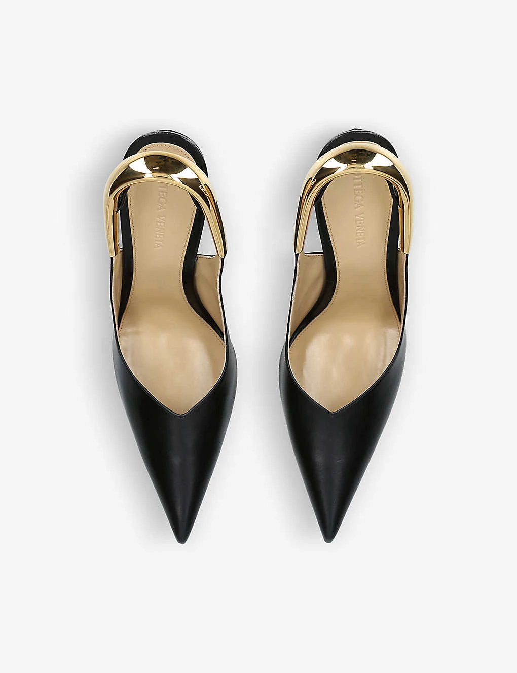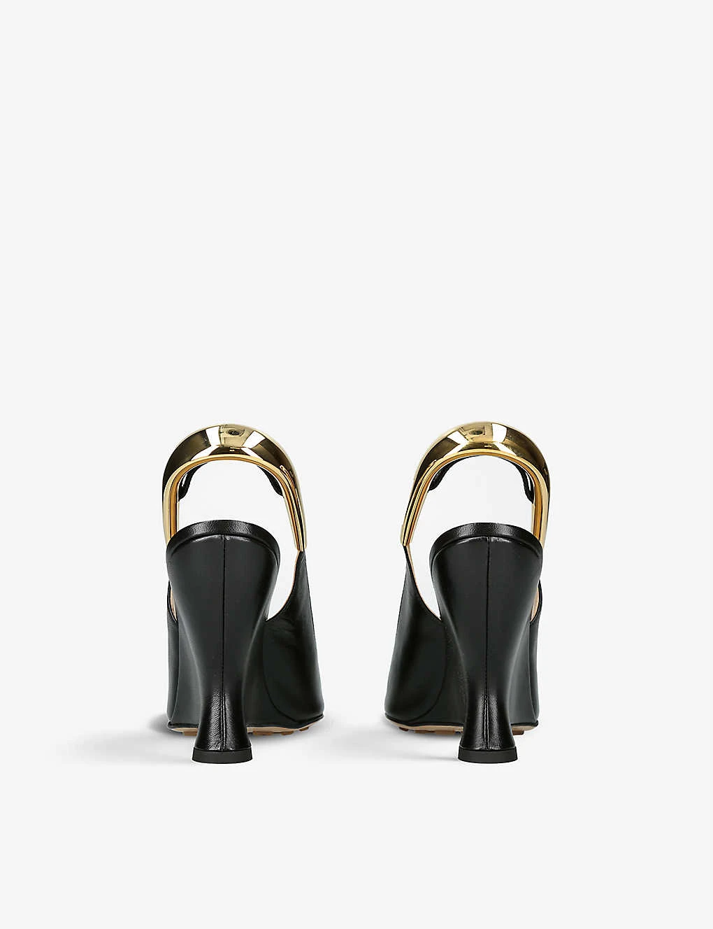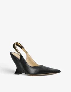 - Pointed toe, wedge heel, slingback, rubber leather outsole, gold-tone hardware