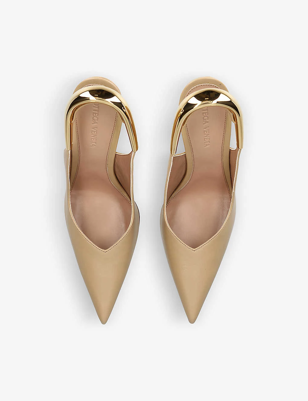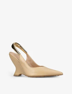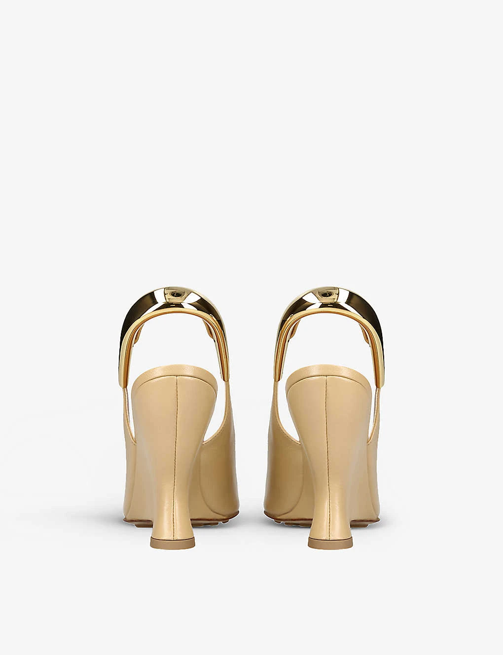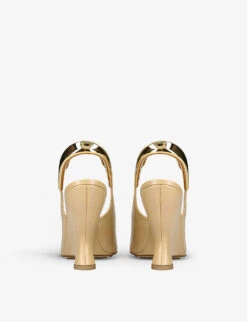 - Pointed toe, closed toe, slingback design, gold-tone appliquΓ© at strap, wedge heel