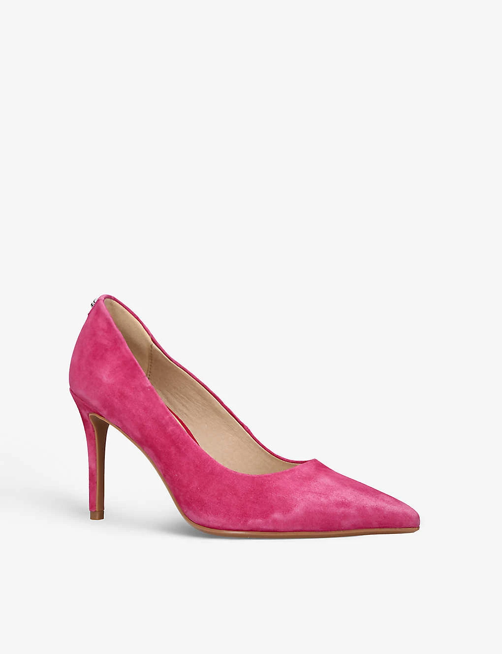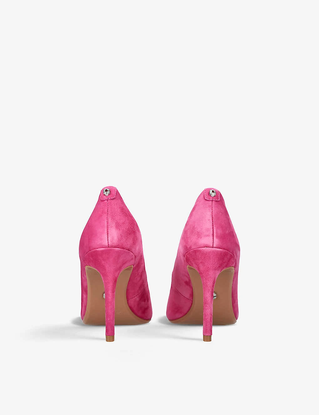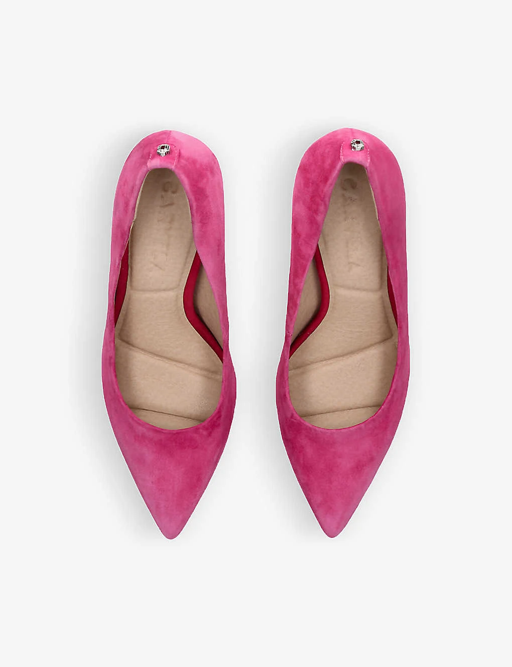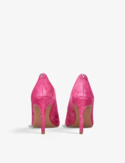 - Pointed closed toe, logo pin at back, all-over tonal stitching, embossed branding on footbed, stiletto heel, silver-tone hardware