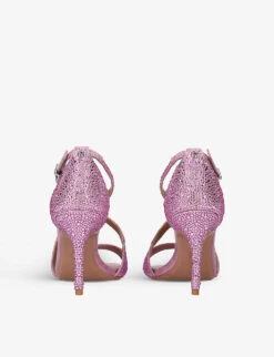 - Open square toe, criss-cross strap at front, all-over crystal embellished, silver-tone logo plaque on sole, adjustable buckle fastening, silver-tone hardware