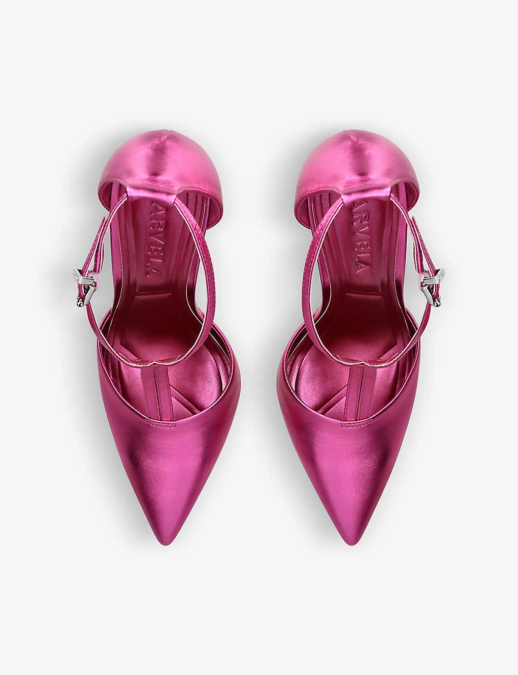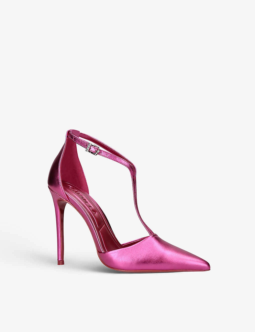 - Pointed toe, T-strap at front, tonal-stitching at front, silver-tone branded hardware, adjustable fastening, logo plaque on sole, metallic finish