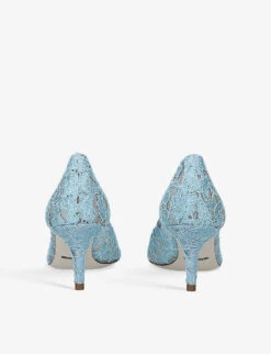 - Pointed toe, all-over lace, crystal-embellished brooch to the front, stiletto heel