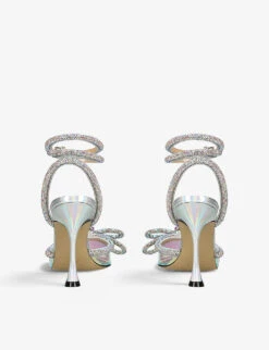 - Clear pointed toe, crystal-embellished bow, wraparound straps, stiletto heel