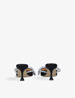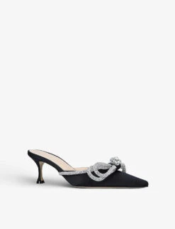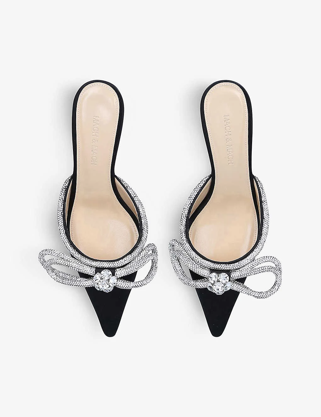 - Pointed toe, closed-toe, crystal-embellished bow, kitten heel