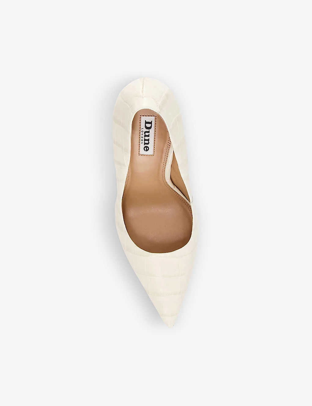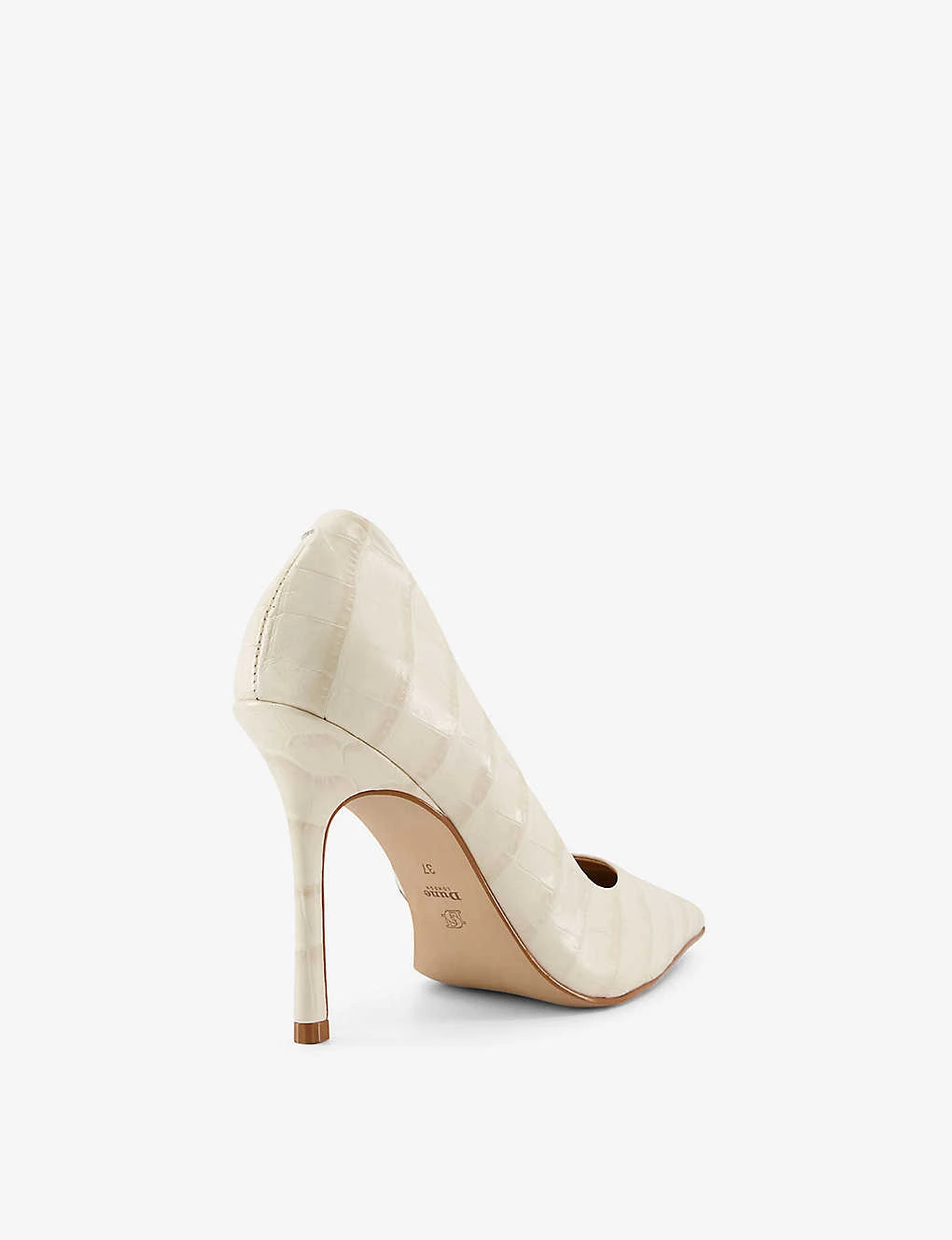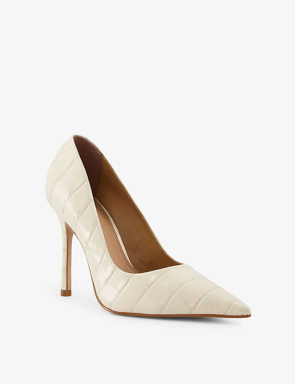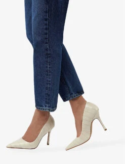 - Pointed closed toe, all-over croc-embossed leather, branded logo on footbed, stiletto heel