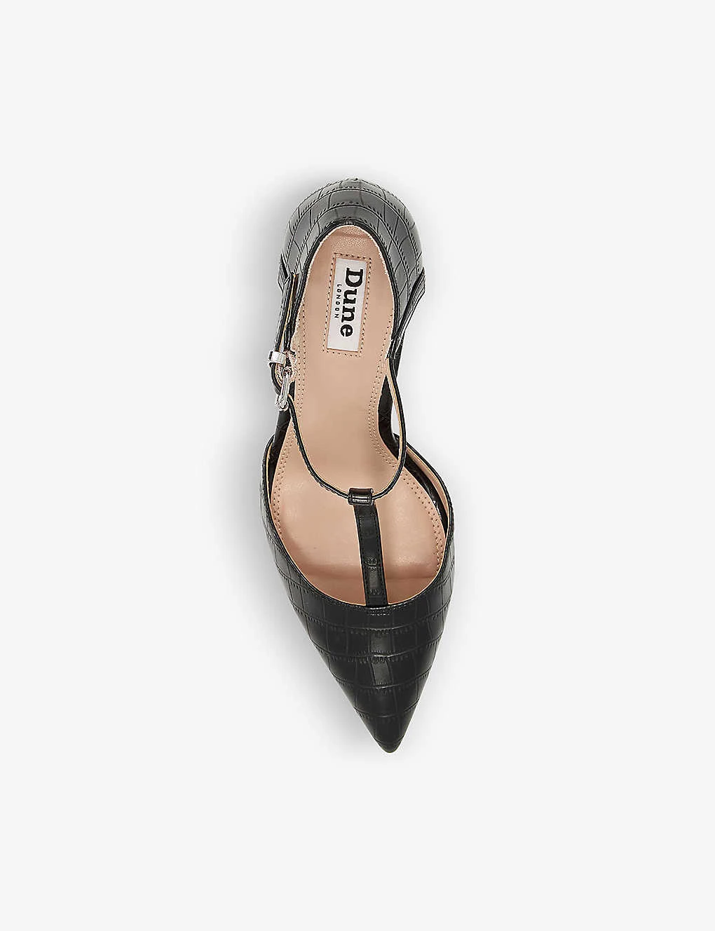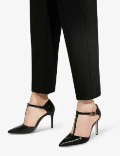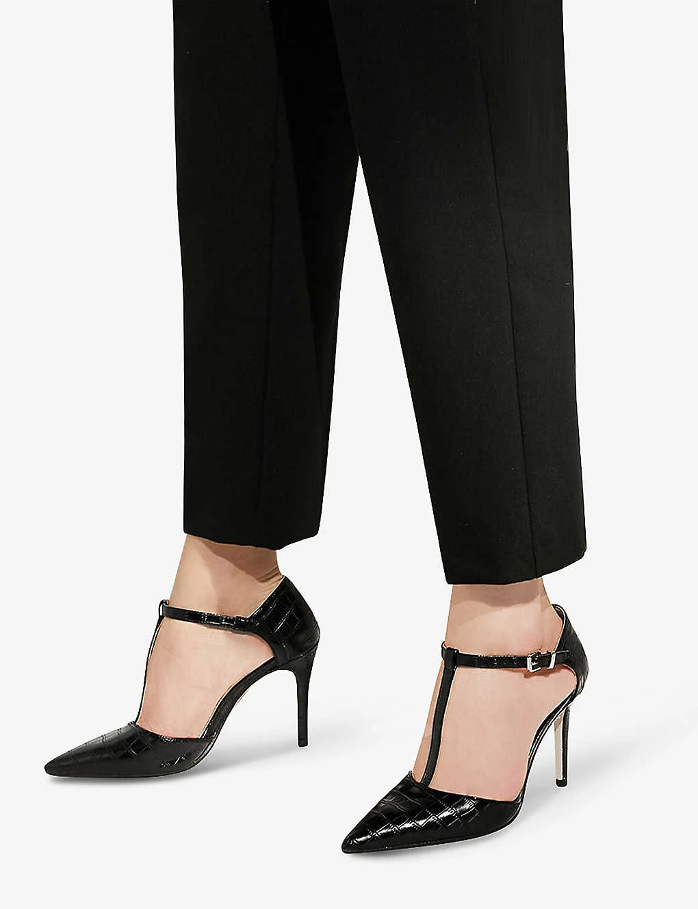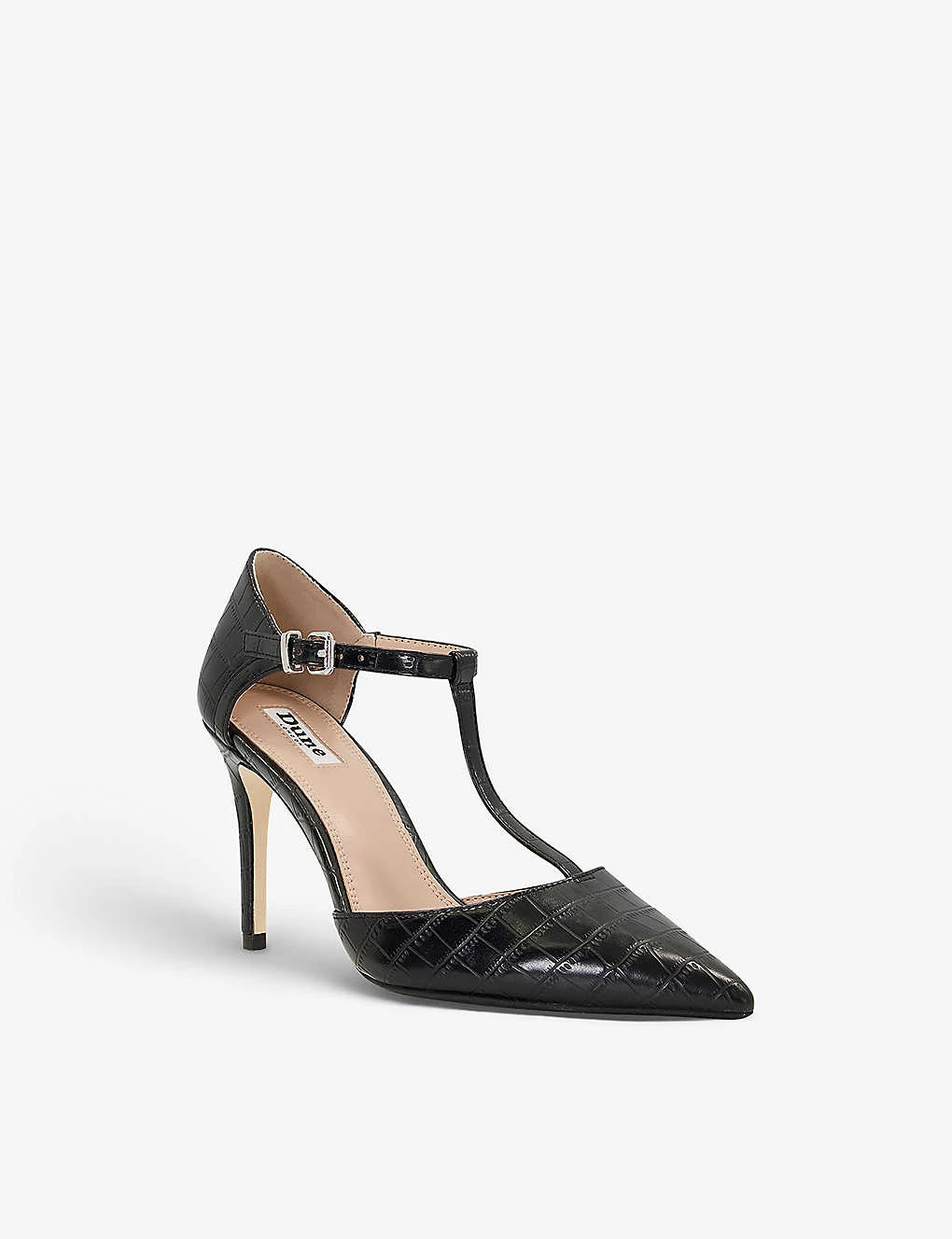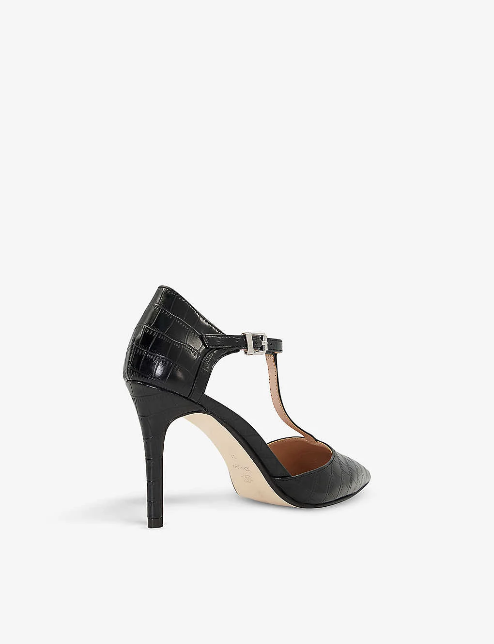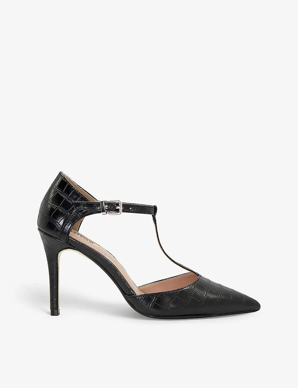 - Closed pointed toe, T-bar strap, adjustable ankle strap, steletto heel, all-over croc-effect, silver-tone hardware