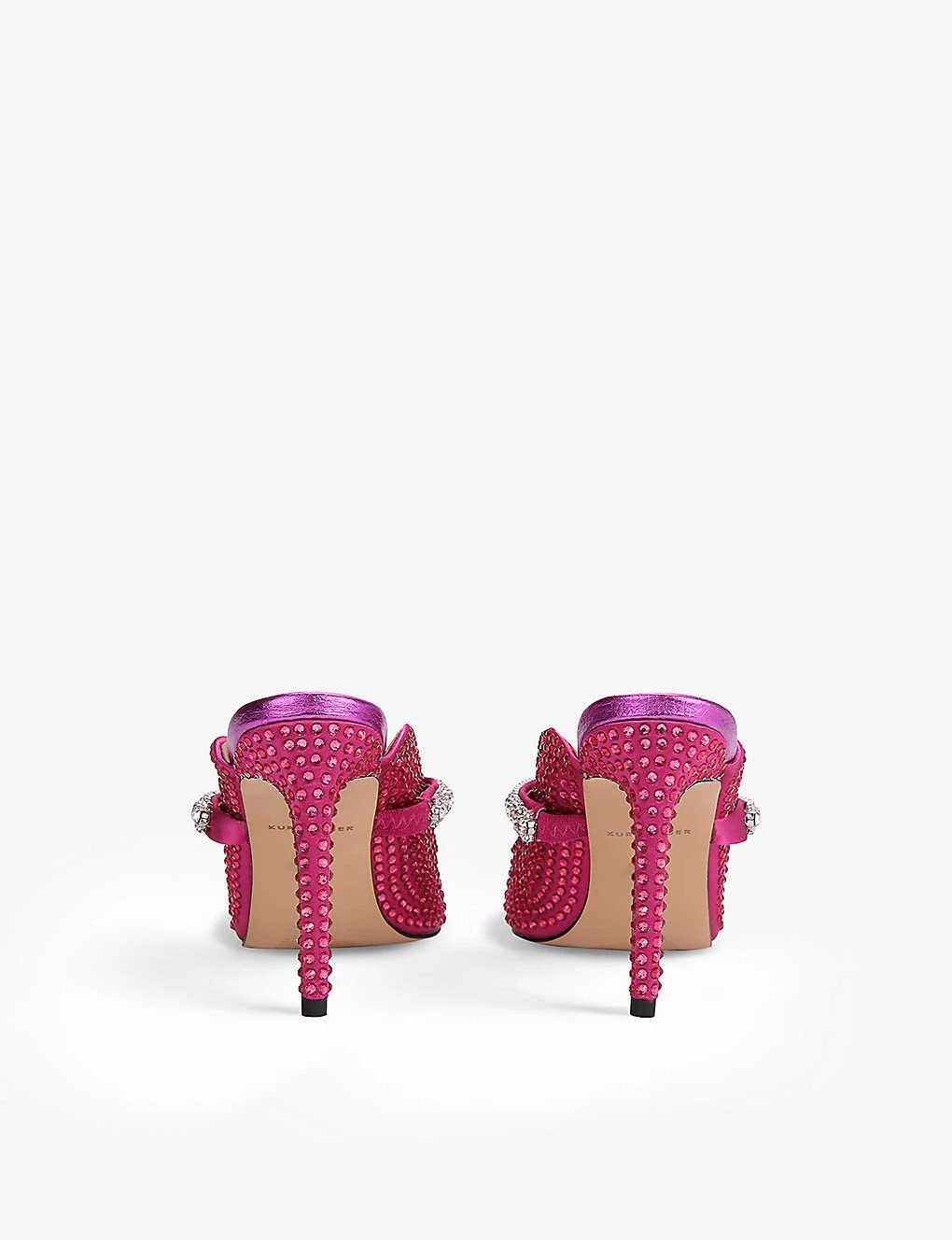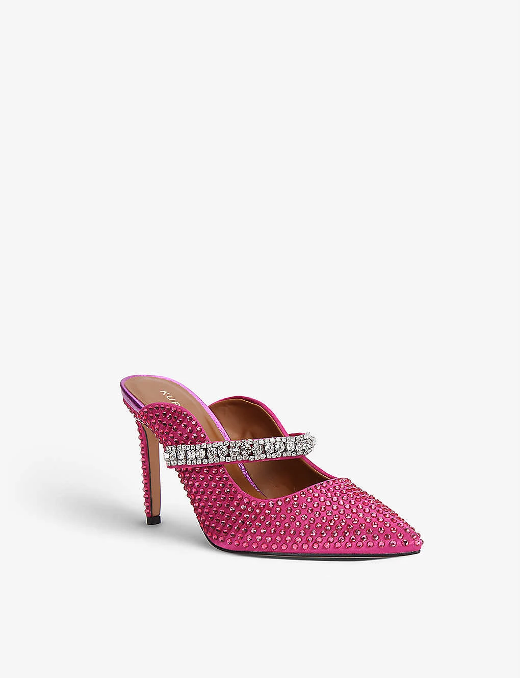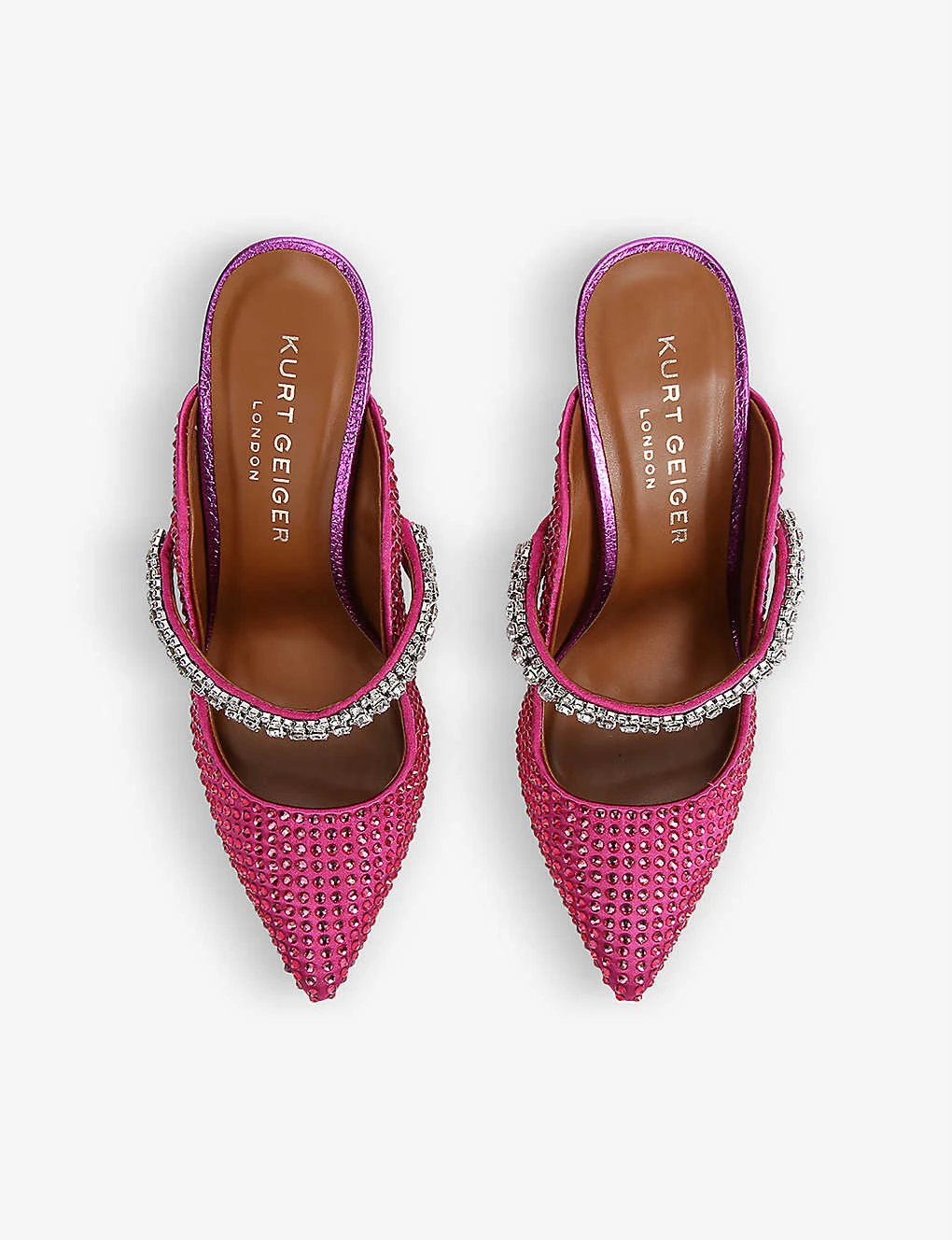 - Pointed toe, all-over crystal embellishments, single front strap, backless, stiletto heel