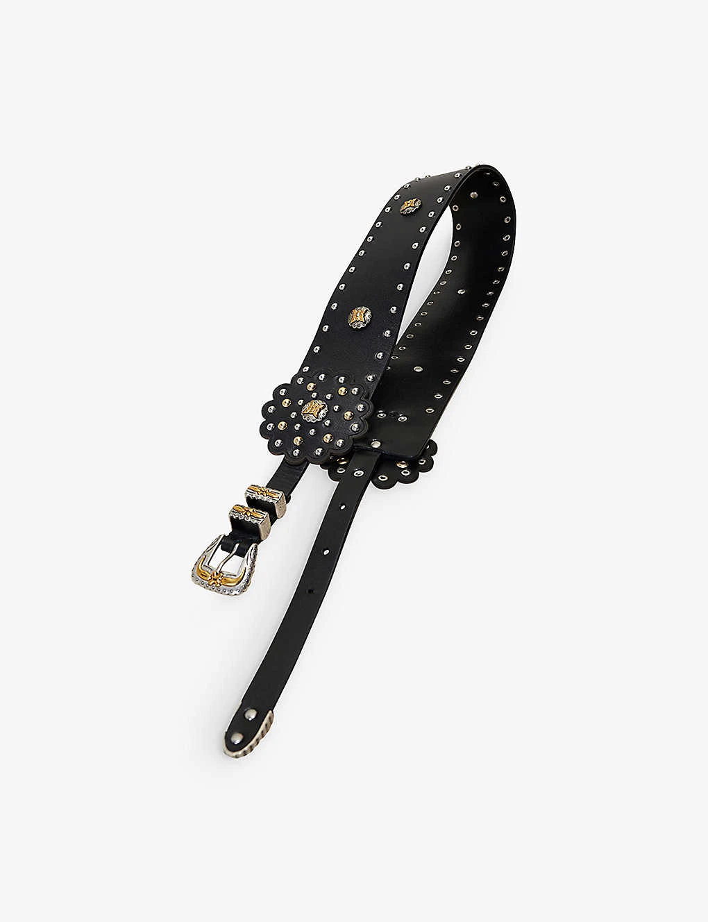 - Wide strap, flower shaped-motifs at each side, all-over stud-embellishment, silver and gold-tone hardware, adjustable length
