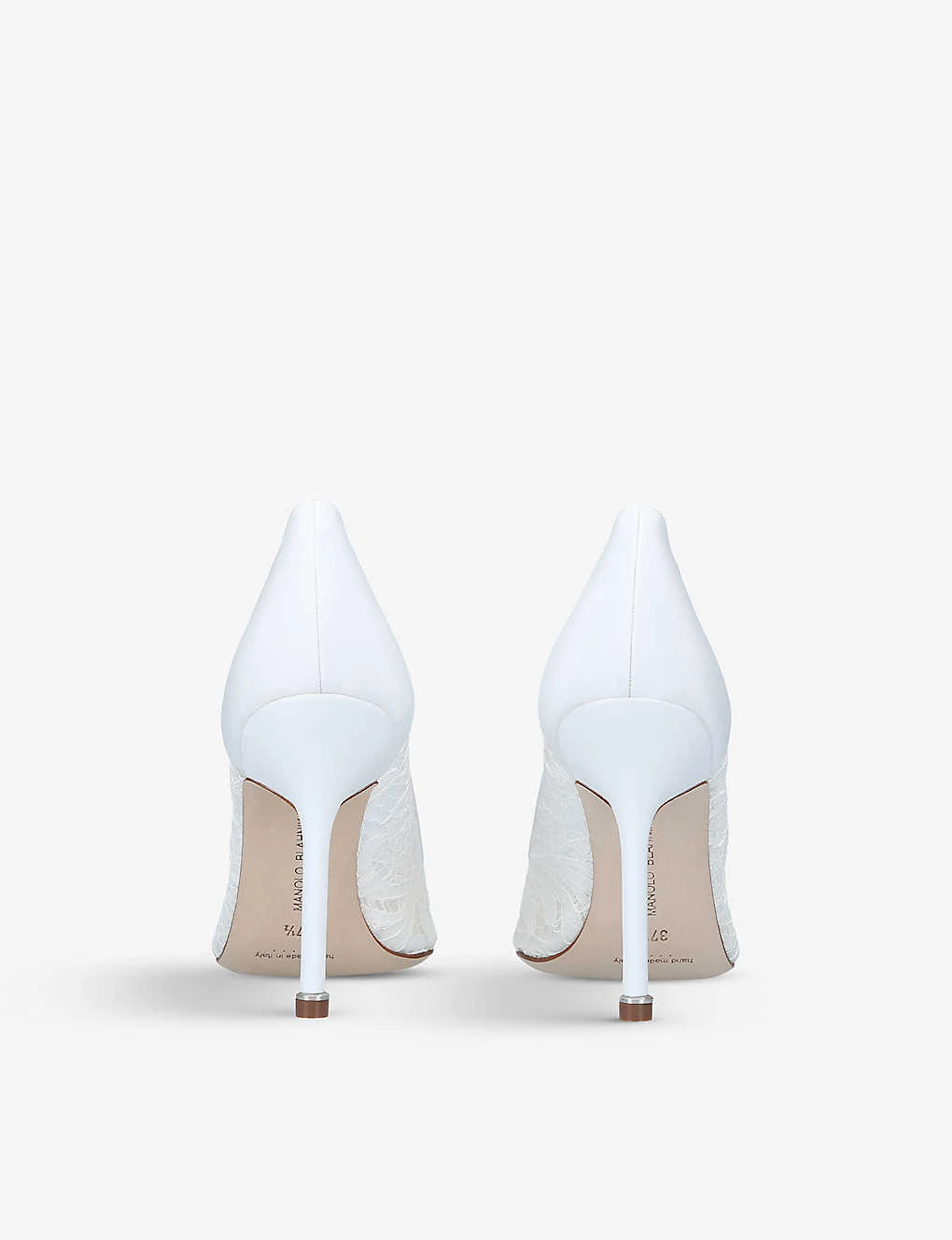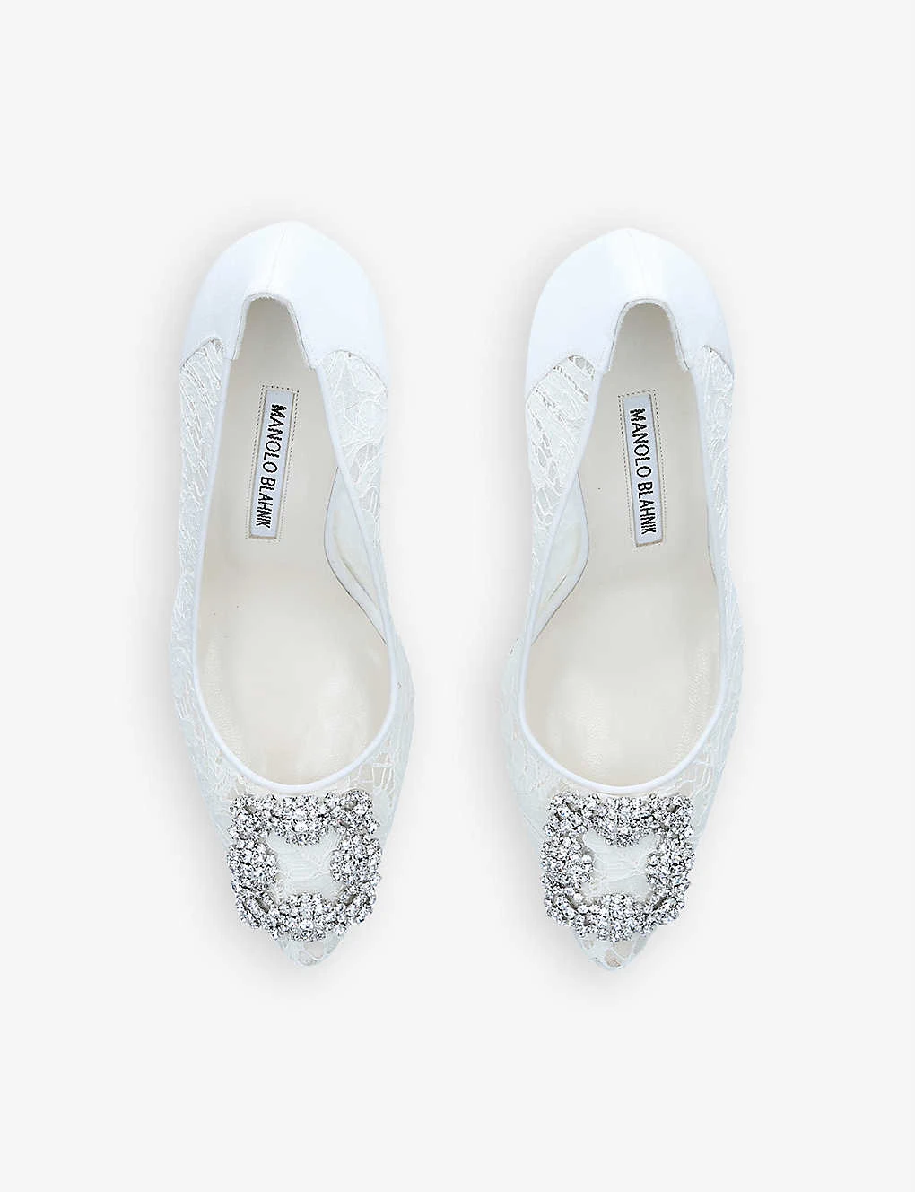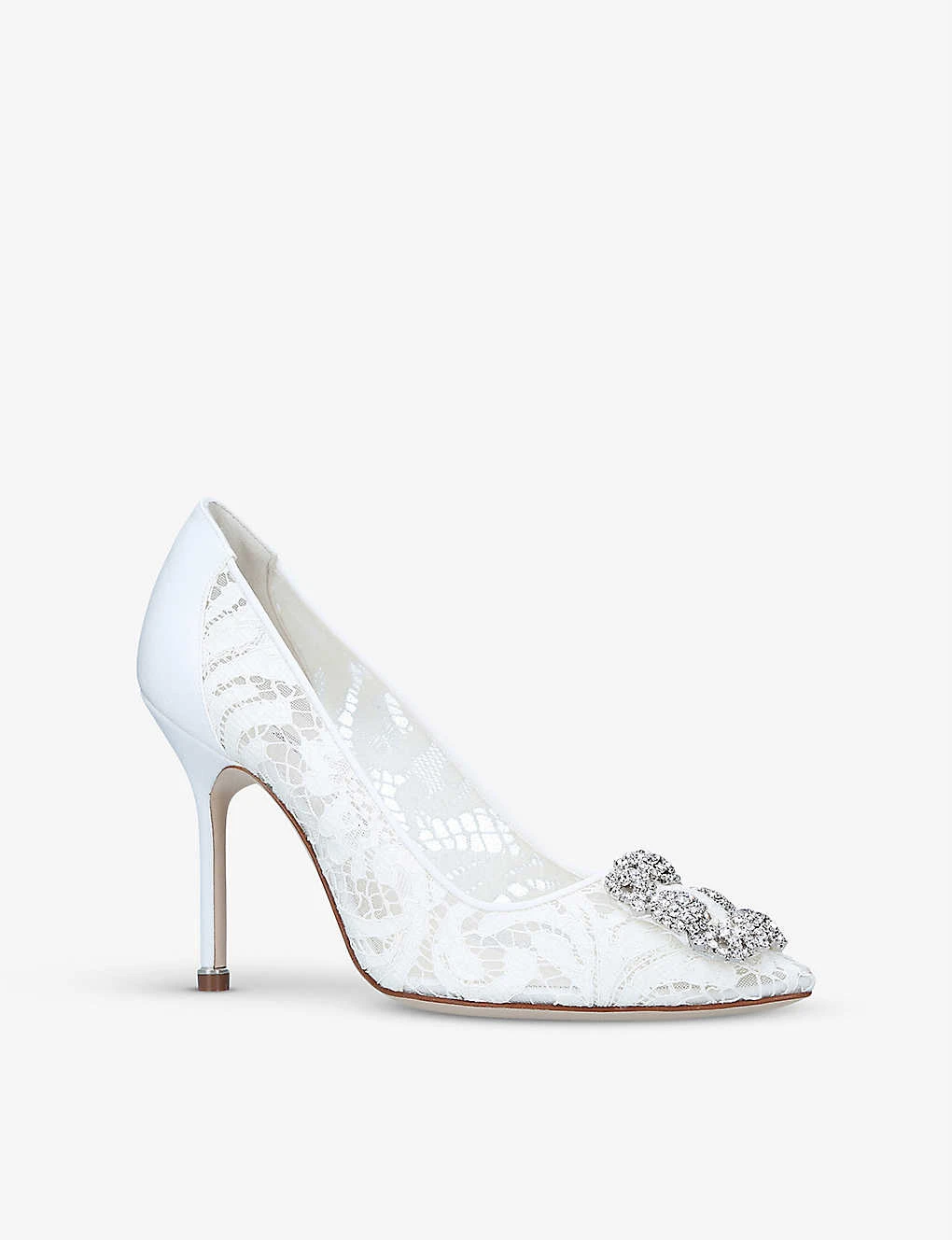 - Pointed toe, stiletto heel, square crystal buckle, branded insole