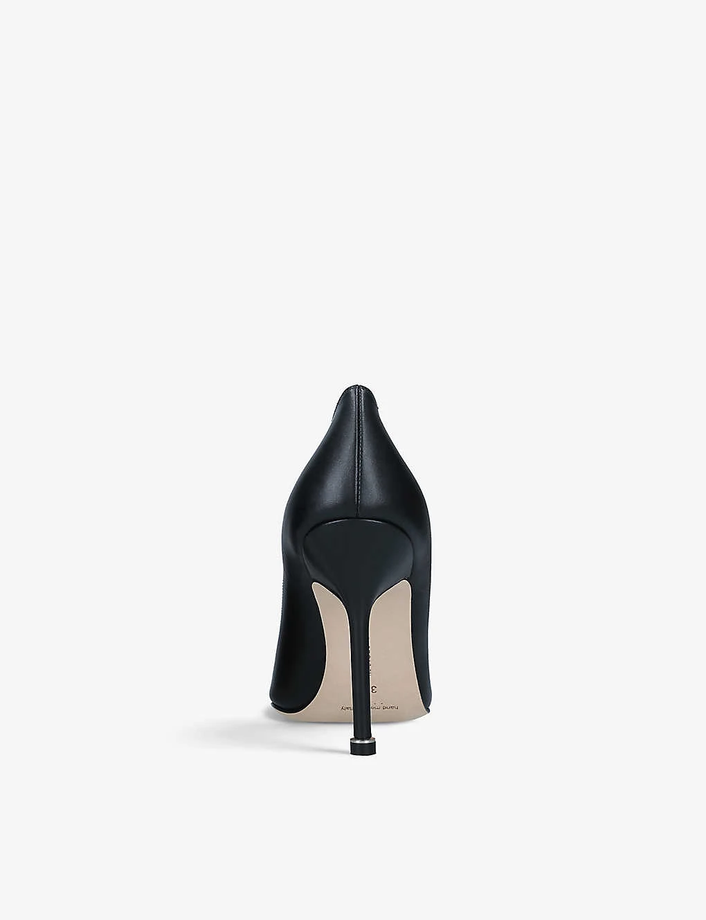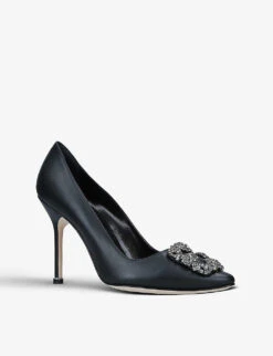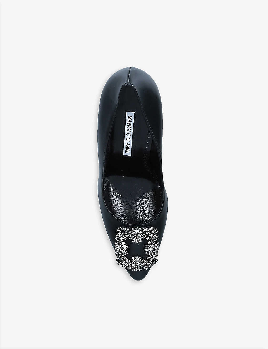 - Pointed toe, Swarovski crystal-embellished buckle, covered heel