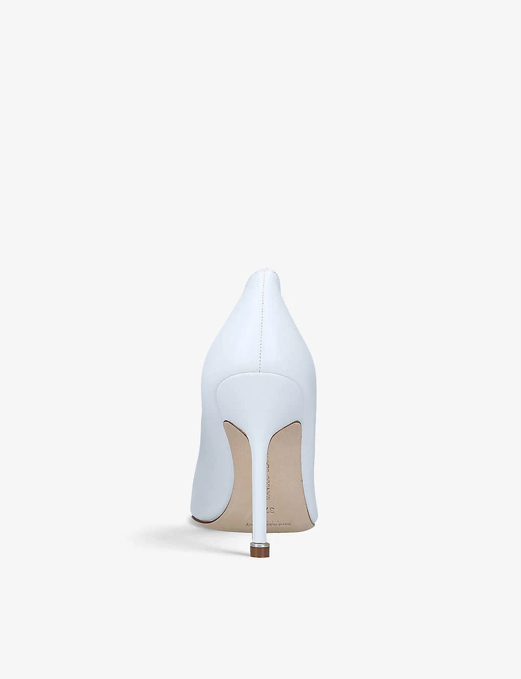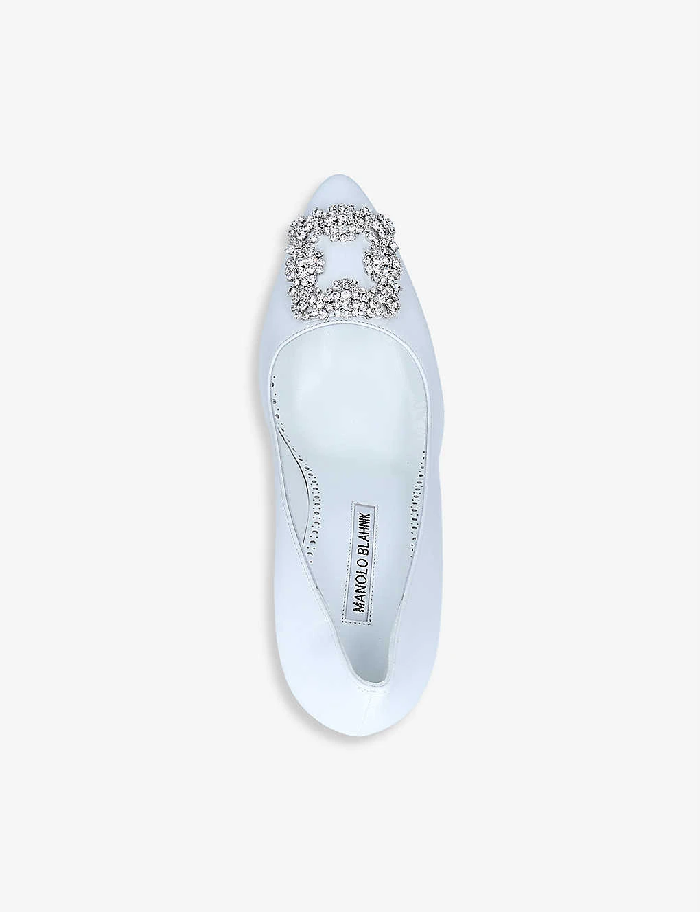 - Pointed toe, Swarovski crystal-embellished buckle, covered heel