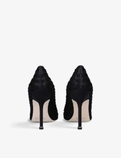 - Pointed toe, textured polka-dot upper, Swarovski crystal-embellished buckle, covered heel