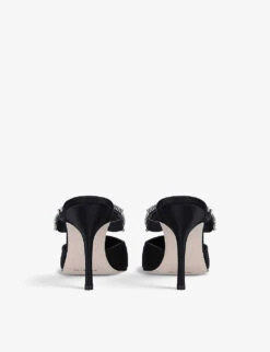 - Pointed toe, crystal-embellished front strap, backless silhouette, stiletto heel