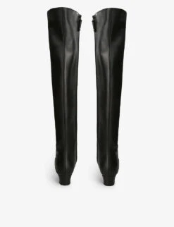 - Pointed toe, tonal stitching, sculptural stacked heel