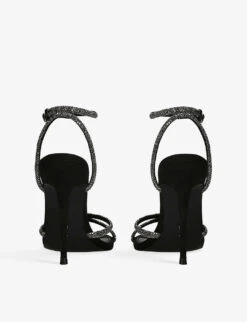 - Open toe, rhinestone-embellished straps, stiletto heels