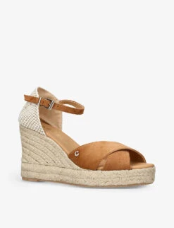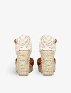 - Open round toe, adjustable ankle strap, contrast woven back panel, front cross-strap design, printed logo on footbed, gold-tone hardware, all-over braid-embellished wedge heel