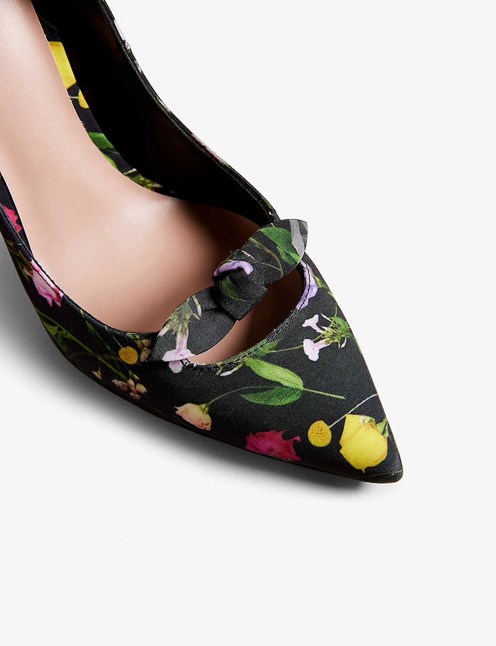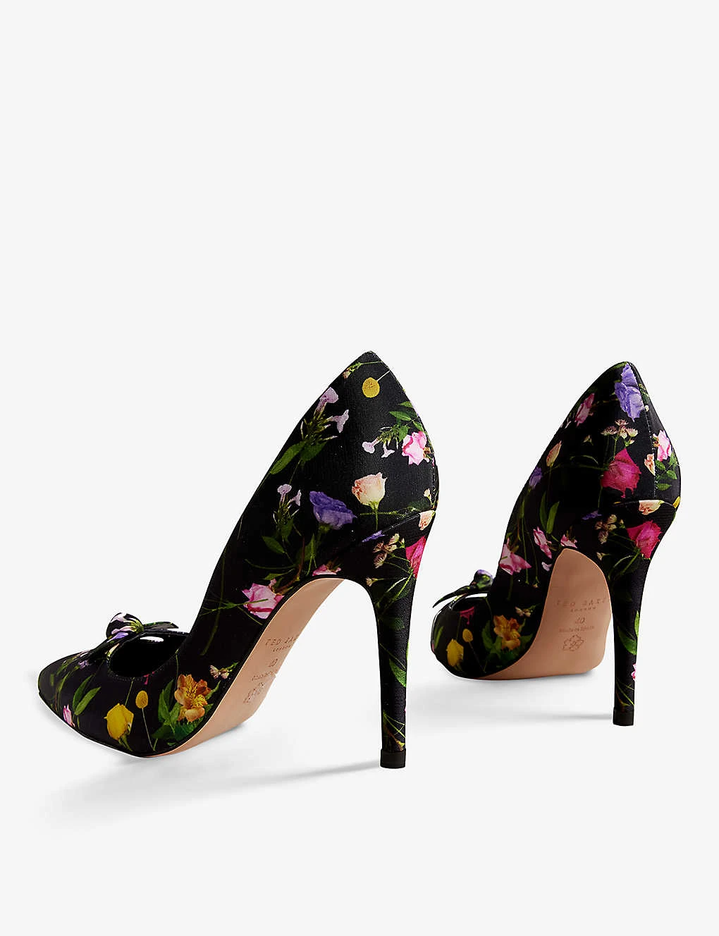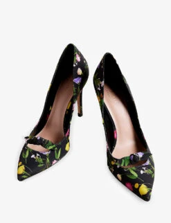- Closed pointed toe, one bow at front, all-over floral print, stiletto heel