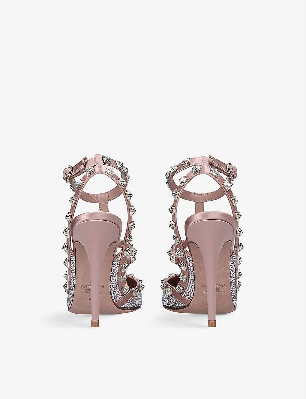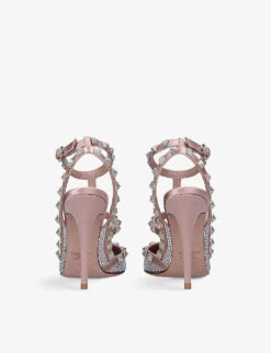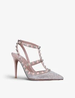 - Pointed toe, T-bar design, silver-toned hardware, stud embellished, rhinestone-embellished, stiletto heel