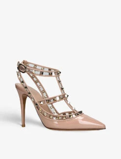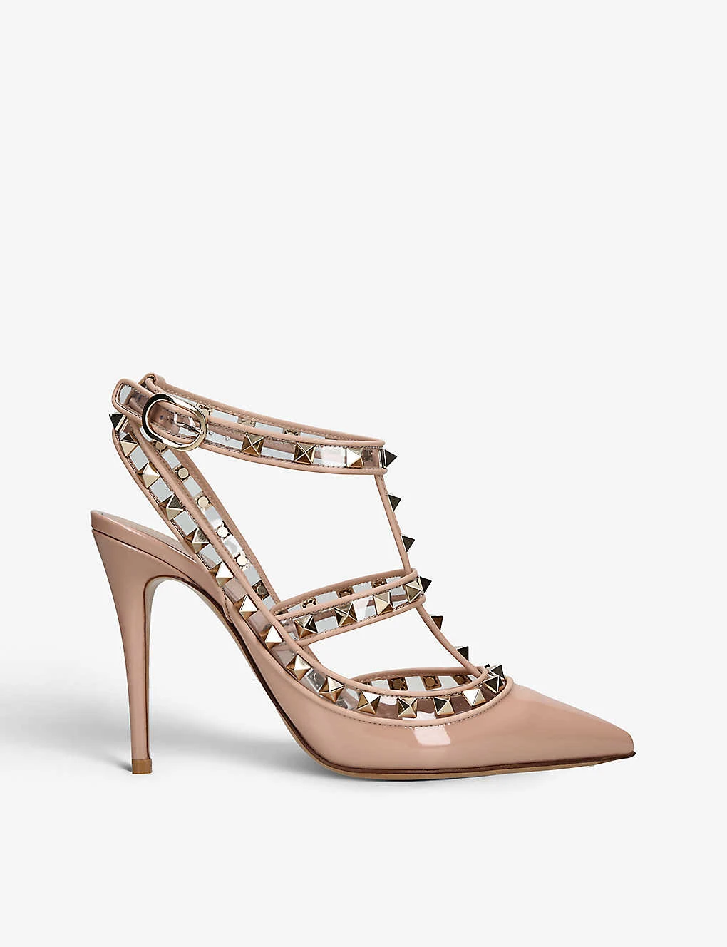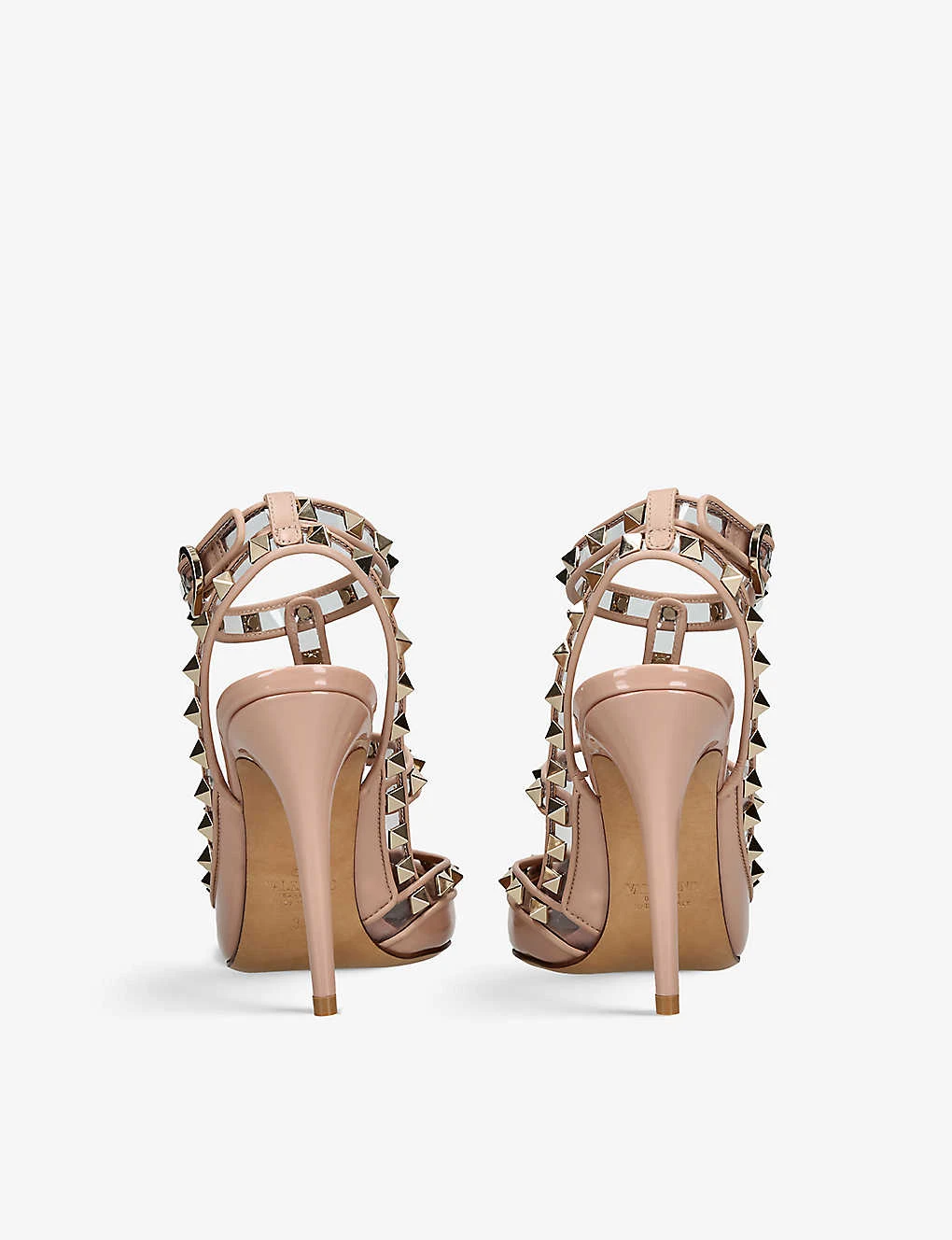- Closed toe, pointed toe, caged strap design, Rockstud embellishments at straps, stiletto heel, gold-tone hardware