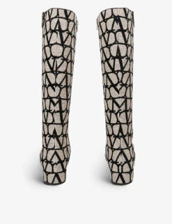 - Square toe, closed toe, logo plaque at hem, knee-high length, block heel, all-over logo print, silver-tone hardware
