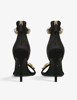 - Open toe, square toe, stiletto heel, crystal-embellished ankle strap, toe strap, logo plaque, gold-toned hardware, branded insole