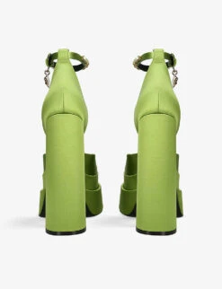 - Crystal-embellished ankle strap, Medusa charm, towering block heel, square toe, platform sole